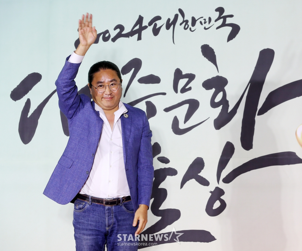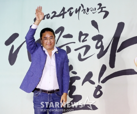 김한민 감독이 31일 오후 서울 중구 국립극장 해오름극장에서 진행된 '2024 대한민국 대중문화예술상' 레드카펫 행사에 참석해 포즈를 취하고 있다.