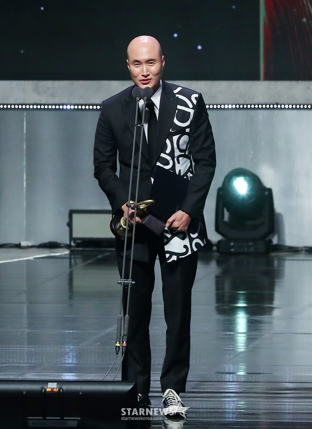 개그맨 윤성호가 31일 오후 서울 중구 국립극장 해오름극장에서 진행된 '2024 대한민국 대중문화예술상'에서 문체부장관 표창을 수상한 뒤 소감을 말하고 있다.