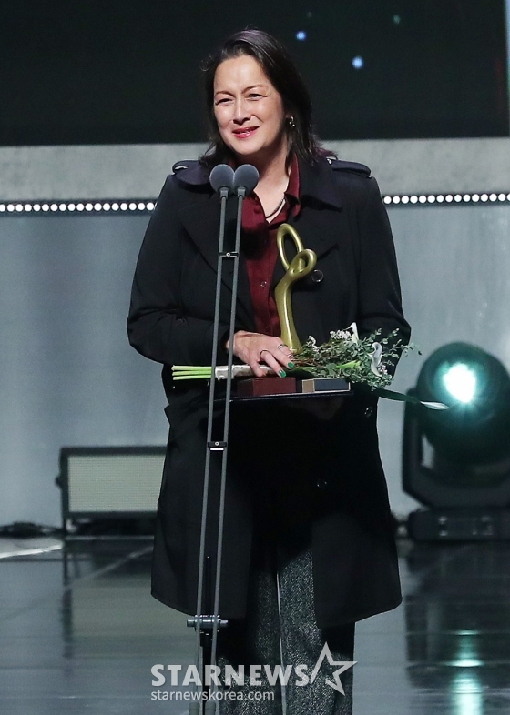 박칼린 음악감독이 31일 오후 서울 중구 국립극장 해오름극장에서 진행된 '2024 대한민국 대중문화예술상'에서 뮤지컬 배우 최재림의 국무총리 표창을 대리 수상한 뒤 소감을 말하고 있다.
