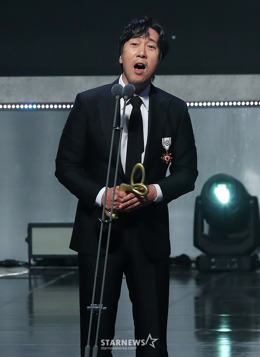 가수 이문세가 31일 오후 서울 중구 국립극장 해오름극장에서 진행된 '2024 대한민국 대중문화예술상'에서 옥관 문화훈장을 수훈한 뒤 소감을 말하고 있다.