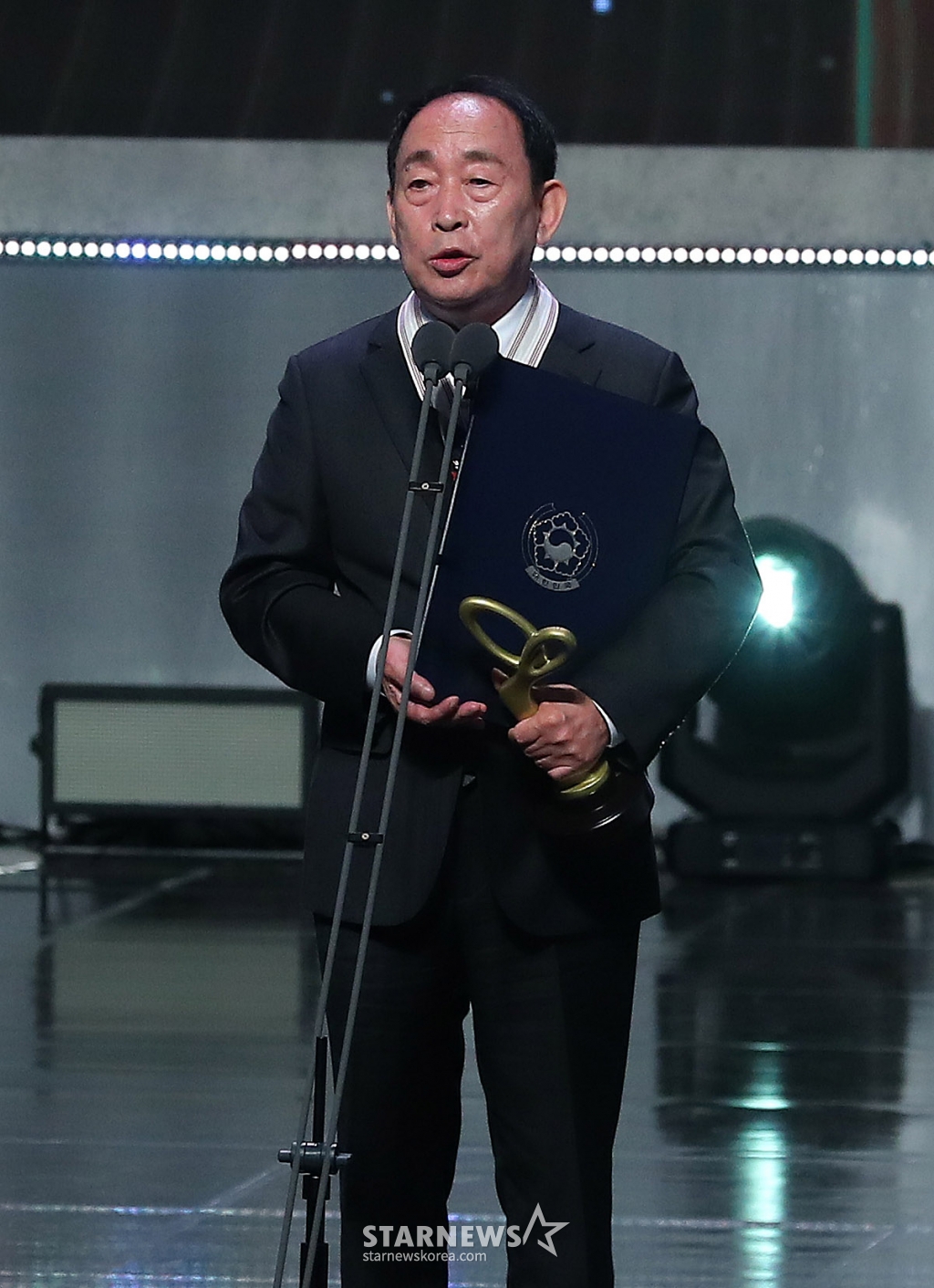 임기홍 방송작가가 31일 오후 서울 중구 국립극장 해오름극장에서 진행된 '2024 대한민국 대중문화예술상'에서 보관 문화훈장을 수훈한 뒤 소감을 말하고 있다.