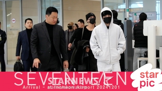 그룹 세븐틴(SEVENTEEN) 조슈아, 버논, 도겸, 에스쿱스, 호시, 준, 원우, 우지, 디에잇, 민규, 승관, 디노가 일본 나고야 공연을 마치고 1일 오전 인천국제공항을 통해 입국하고 있다. 2024.12.01