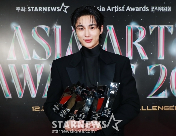 배우 변우석이 27일 오후 태국 방콕 임팩트 챌린저 홀 1-2(IMPACT Challenger Hall 1-2)에서 진행된 '제9회 아시아 아티스트 어워즈'(The 9th Asia Artist Awards, 이하 'AAA 2024')에서 AAA 파퓰리티, 아시아 셀러브리티, 베스트 아티스트, 베스트 커플, 베스트 OST, 올해의 남우주연상을 수상한 뒤 포즈를 취하고 있다.