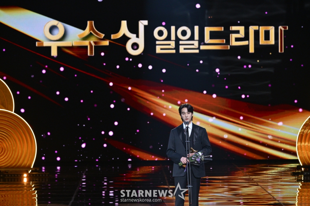 배우 오창석이 11일 오후 KBS 2TV에서 방송된 '2024 KBS 연기대상'에서 일일드라마 우수상을 수상한 뒤 소감을 말하고 있다.