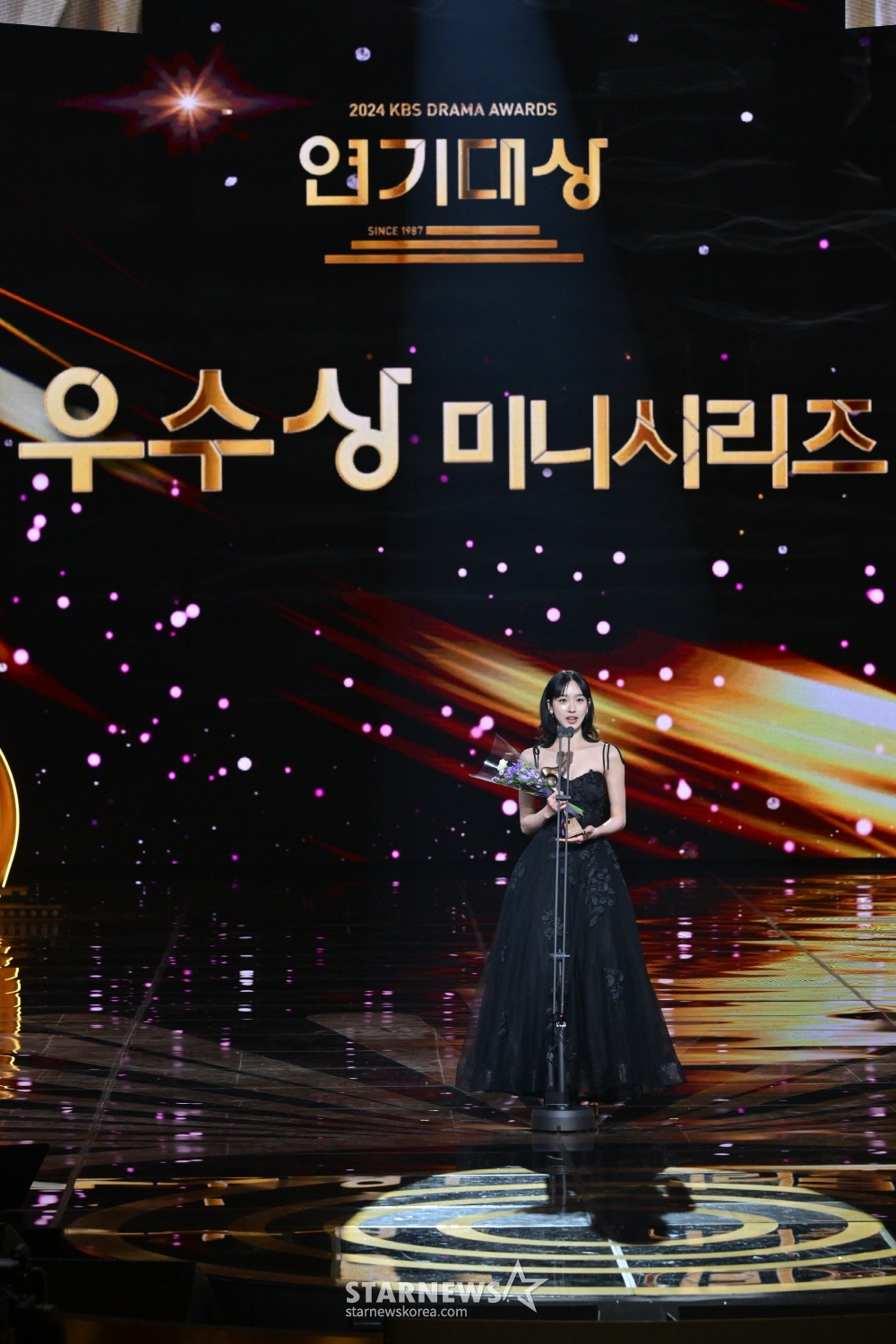 배우 한지현이 11일 오후 KBS 2TV에서 방송된 '2024 KBS 연기대상'에서 미니시리즈 우수상을 수상한 뒤 소감을 말하고 있다.