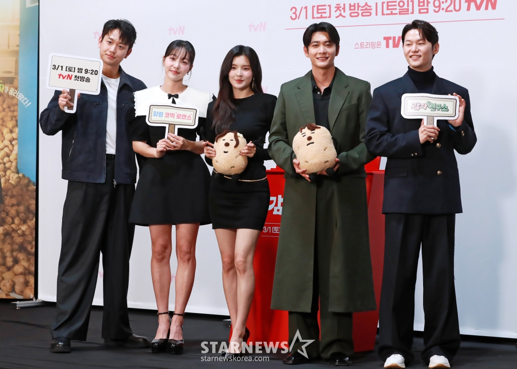 배우 신현승, 김가은, 이선빈, 강태오, 이학주가 27일 오후 서울 신도림 라마다 호텔에서 진행된 tvN 새 토일드라마 '감자연구소' 제작발표회에 참석해 포즈를 취하고 있다.