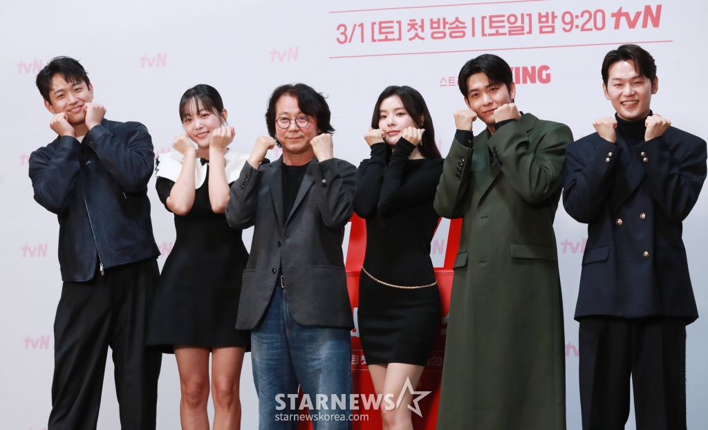 배우 신현승, 김가은, 강일수 감독, 배우 이선빈, 강태오, 이학주가 27일 오후 서울 신도림 라마다 호텔에서 진행된 tvN 새 토일드라마 '감자연구소' 제작발표회에 참석해 포즈를 취하고 있다.