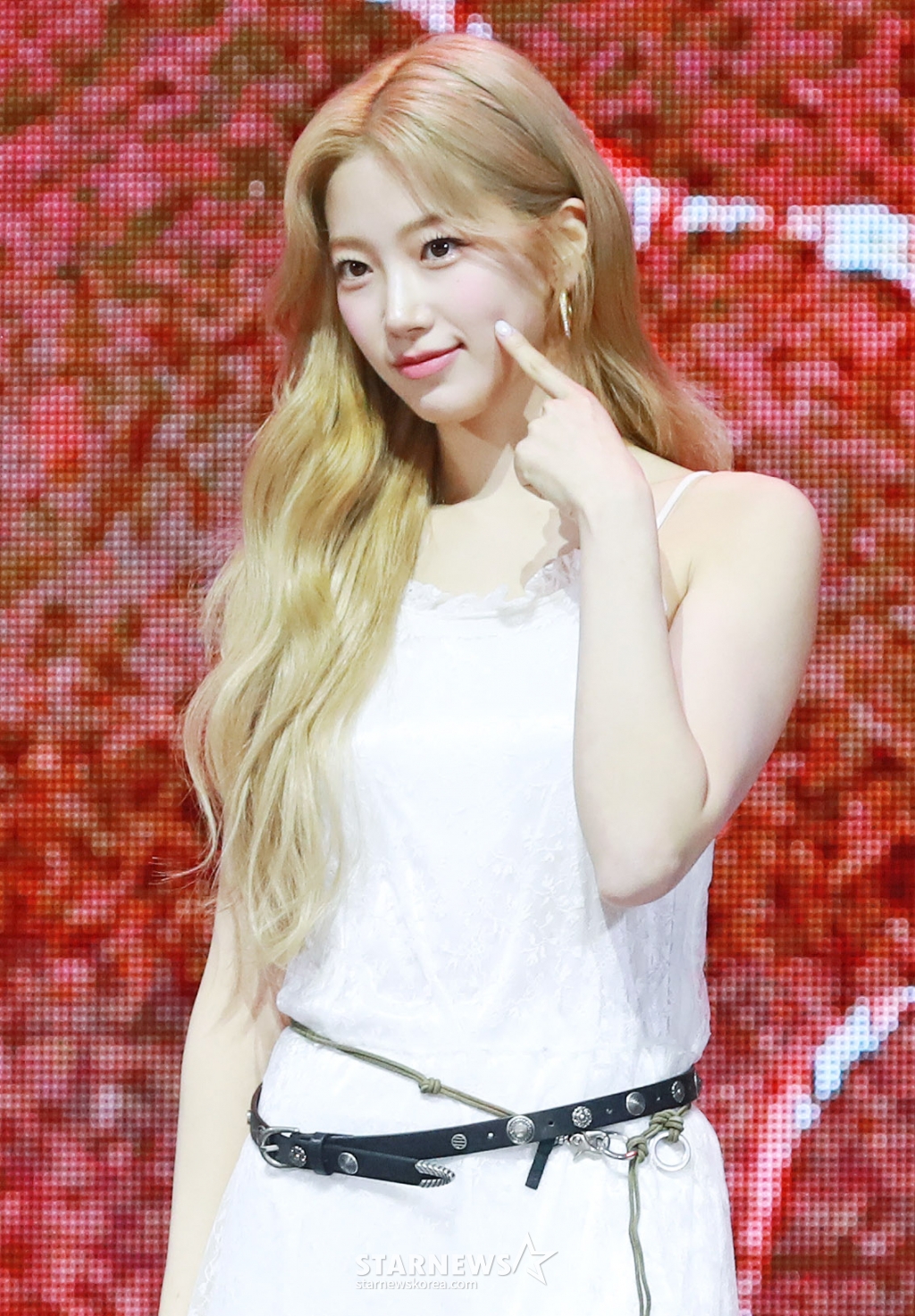 걸그룹 르세라핌(LE SSERAFIM) 카즈하가 14일 오전 서울 광진구 예스24라이브홀에서 진행된 미니 5집 ‘HOT’ 발매기념 쇼케이스에서 포즈를 취하고 있다.
