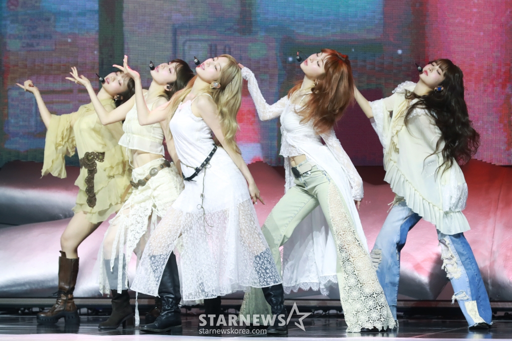 걸그룹 르세라핌(LE SSERAFIM)이 14일 오전 서울 광진구 예스24라이브홀에서 진행된 미니 5집 ‘HOT’ 발매기념 쇼케이스에서 신곡을 선보이고 있다.