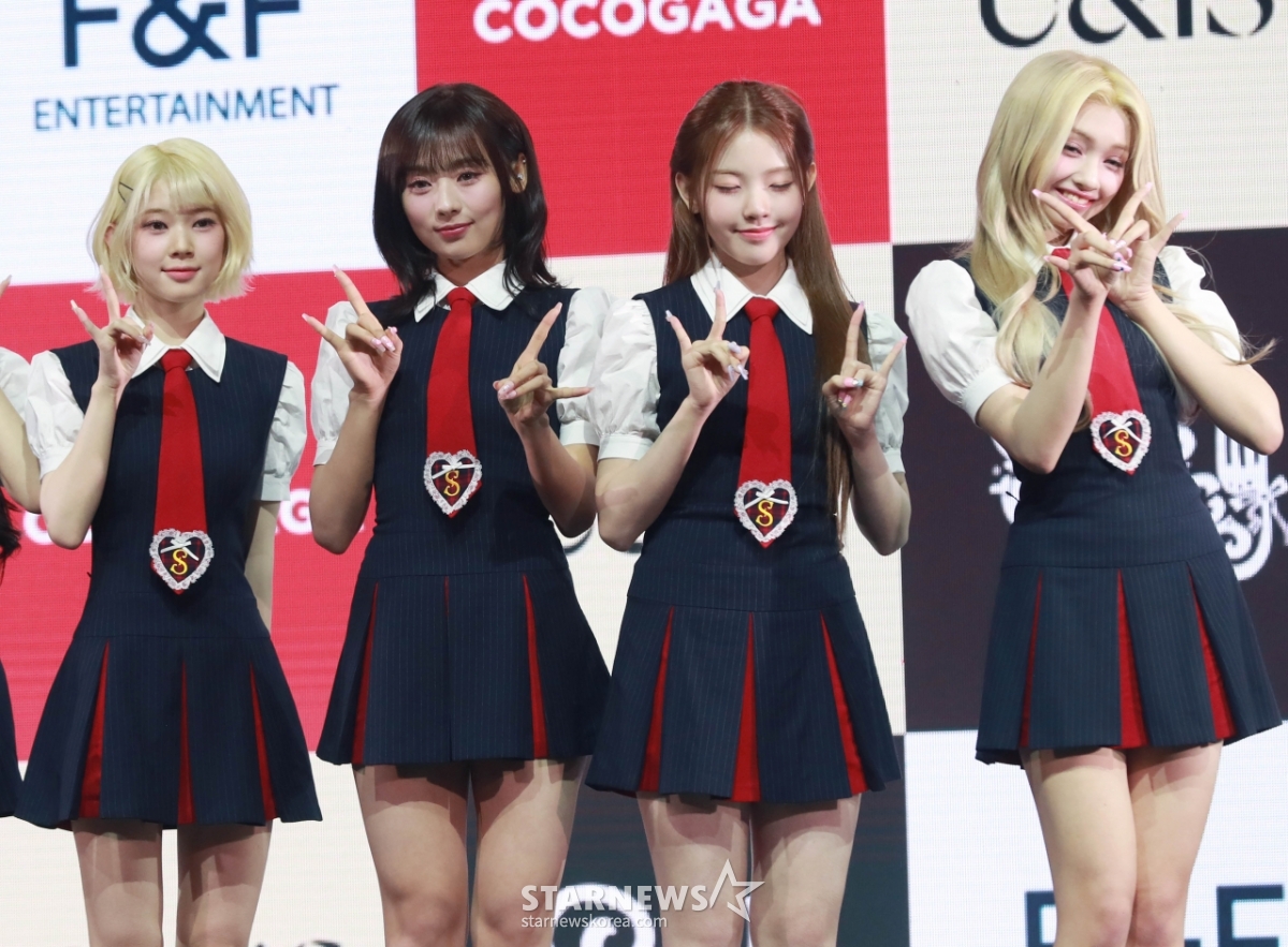 걸그룹 유니스(UNIS)가 15일 오후 서울 광진구 예스24라이브홀에서 진행된 두 번째 미니앨범 '스위시'(SWICY) 발매기념 쇼케이스에서 포즈를 취하고 있다.