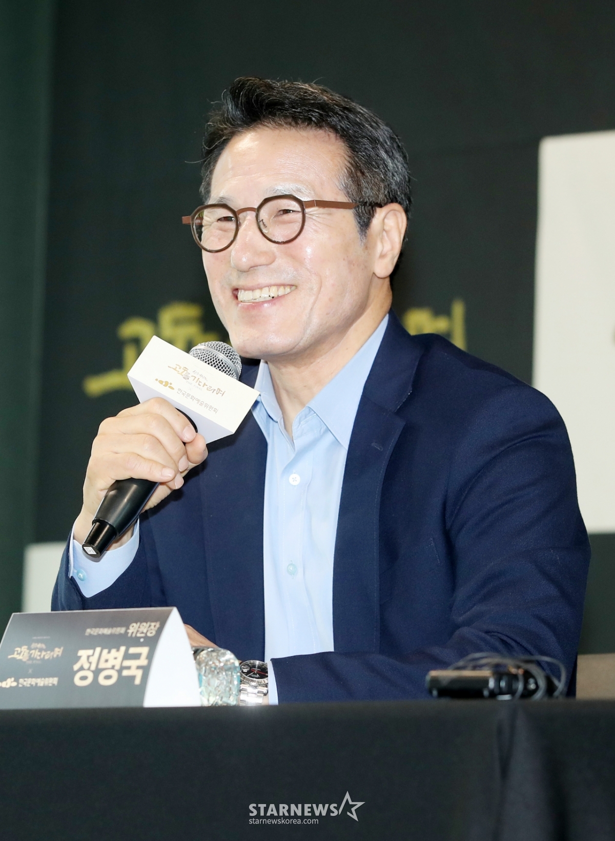 정병국 한국문화예술위원회 위원장이 23일 서울 종로구 예술가의 집에서 진행된 연극 '고도를 기다리며' 기자간담회에 참석해 질의응답을 하고 있다.