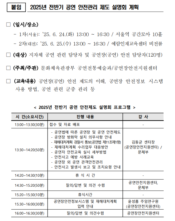 문화체육관광부(장관 유인촌)는 한국산업기술시험원(공연안전지원센터)과 함께 지자체 공연·공연장 안전 담당자를 대상으로 서울(24일)과 대전(25일)에서 '전반기 공연 안전관리 제도 설명회'를 개최하고 현장 의견을 수렴한다고 밝혔다.