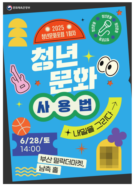 문화체육관광부(장관 유인촌)는 오는 28일 오후 2시 밀락더마켓 남측홀(부산 수영구)에서 '청년문화사용법: 내일을 그리다'를 주제로 '2025년 제1차 청년문화포럼'을 개최, 문화를 통해 청년들이 살고 싶어 하는 세상에 대해 이야기한다고 밝혔다.