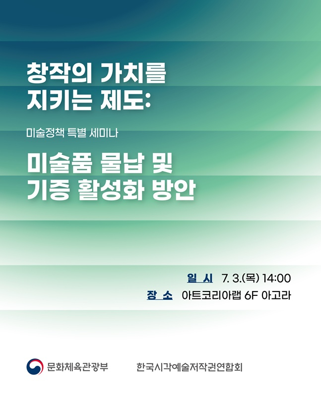 이번 세미나에서는 '창작의 가치를 지키는 제도: 미술품 물납 및 기증 활성화 방안'을 주제로 2023년 상속세에 대한 미술품 물납제가 시행된 이후의 제도 현황과 관련 현안들을 점검하고, 미술품 물납제의 활성화 방안을 논의한다.