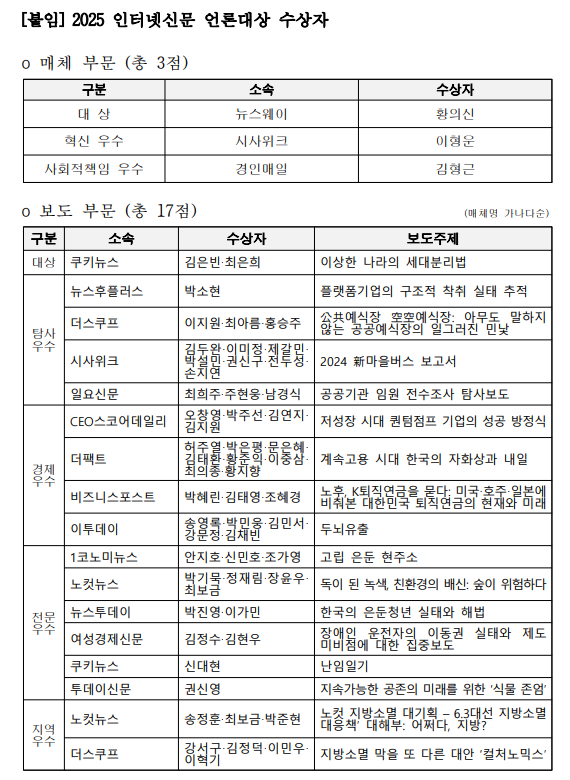 한국인터넷신문협회(회장 김기정 그린포스트코리아 대표)는 14일 '2025 인터넷신문 언론대상' 수상자를 발표했다. 올해로 9회를 맞은 이번 시상은 한국언론학회 배진아 회장이 위원장을 맡고, 언론계·학계 인사들로 구성된 심사위원회가 3주간의 심사를 거쳐 매체 부문 3개사, 보도 부문 17편을 최종 선정했다.