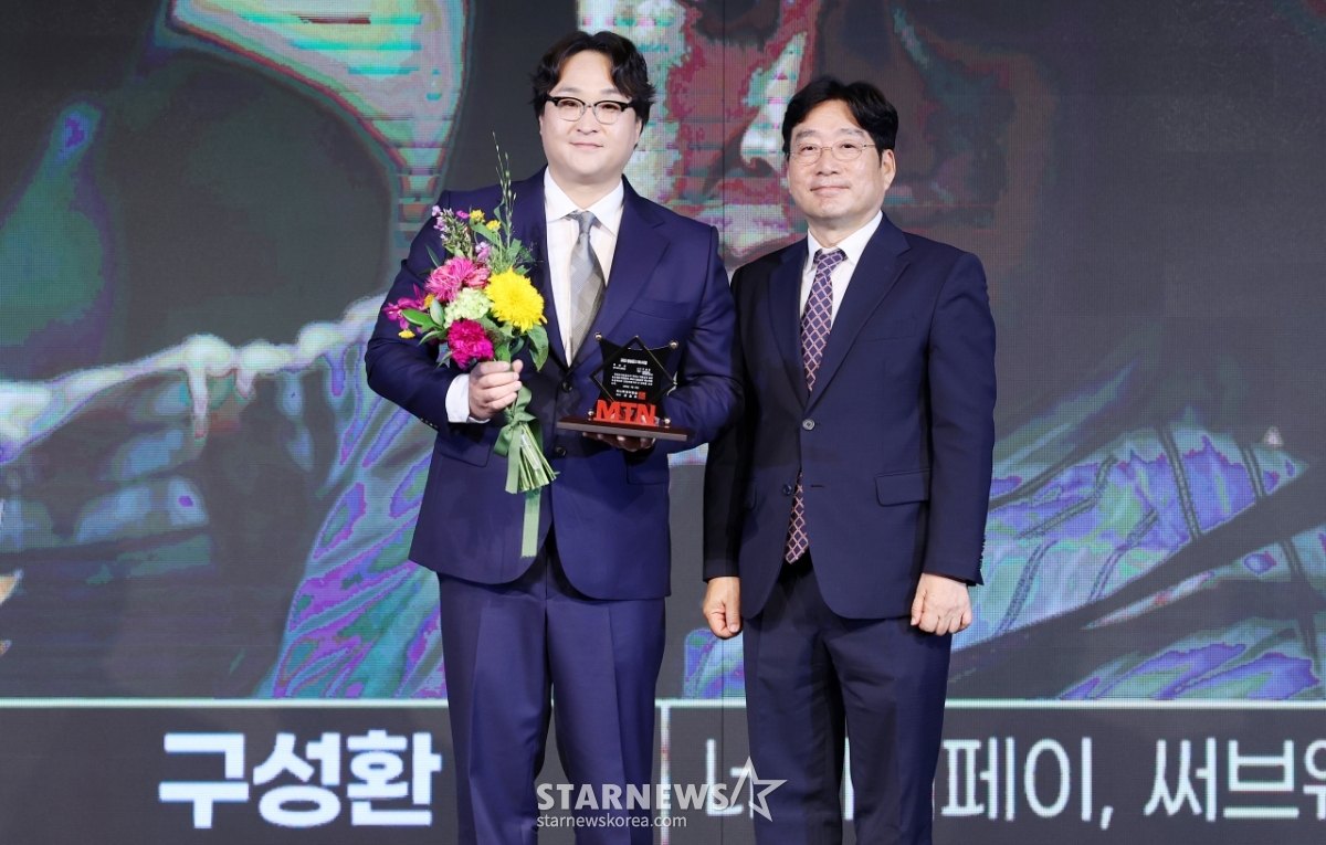 배우 구성환이 22일 서울 영등포구 중소기업중앙회에서 열린 '2025 방송광고페스티벌' 시상식에서 특별상을 수상한 뒤 유승호 머니투데이방송 대표와 기념촬영을 하고 있다.