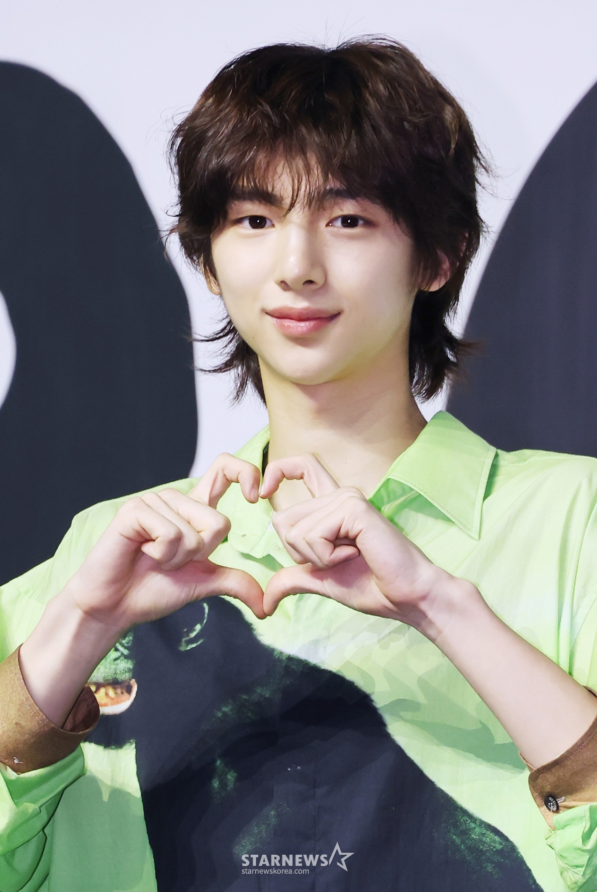 빅히트 신인그룹 코르티스(CORTIS) 주훈이 18일 오후 서울 용산구 블루스퀘어에서 진행된 데뷔앨범 '컬러 아웃사이드 더 라인스'(COLOR OUTSIDE THE LINES) 발매기념 쇼케이스에서 포즈를 취하고 있다.