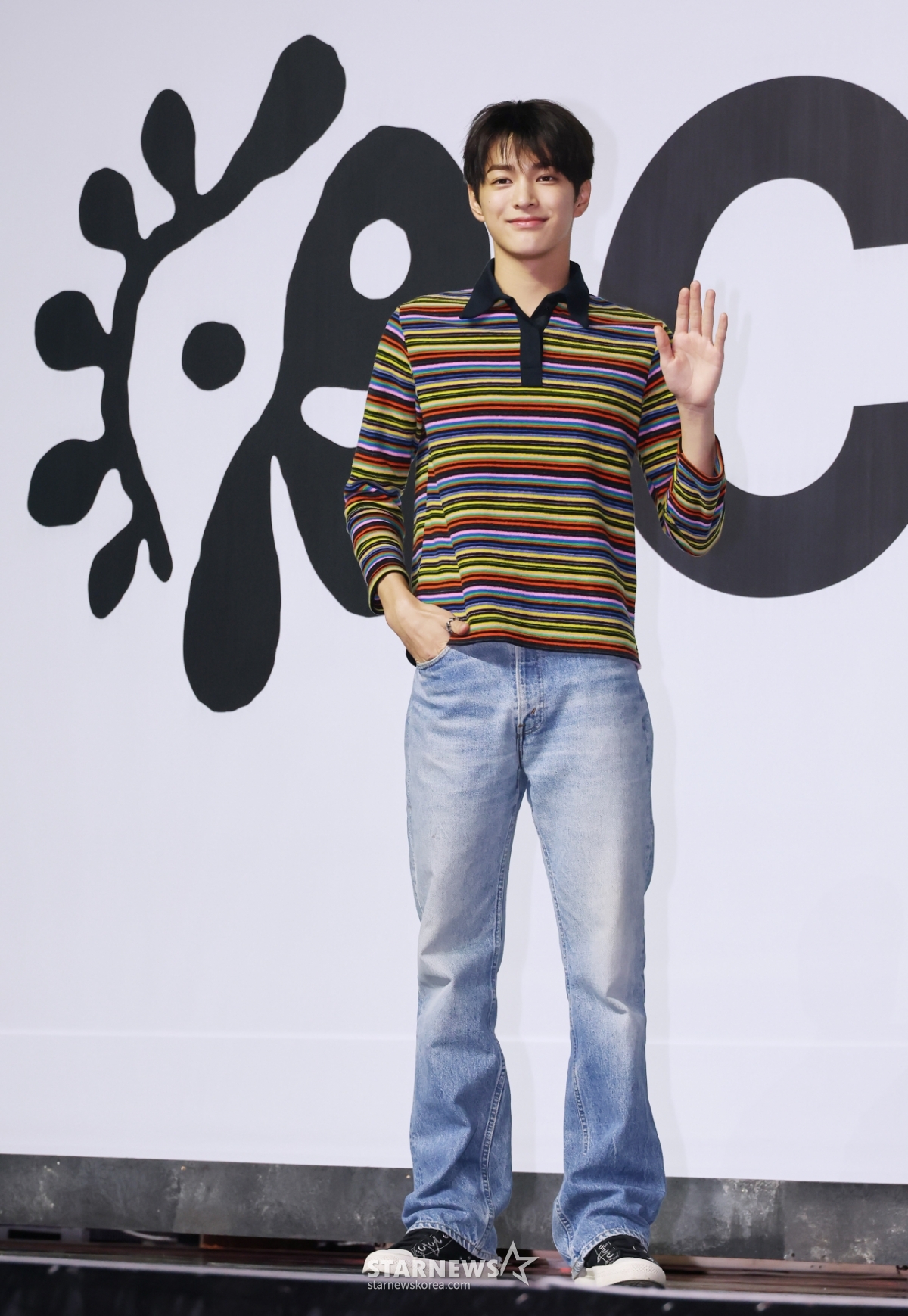 빅히트 신인그룹 코르티스(CORTIS) 건호가 18일 오후 서울 용산구 블루스퀘어에서 진행된 데뷔앨범 '컬러 아웃사이드 더 라인스'(COLOR OUTSIDE THE LINES) 발매기념 쇼케이스에서 포즈를 취하고 있다.