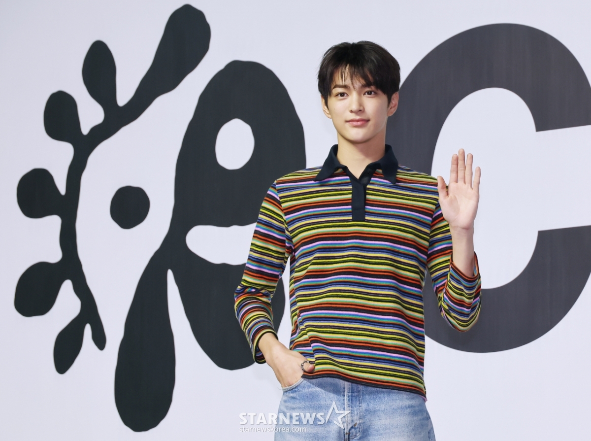 빅히트 신인그룹 코르티스(CORTIS) 건호가 18일 오후 서울 용산구 블루스퀘어에서 진행된 데뷔앨범 '컬러 아웃사이드 더 라인스'(COLOR OUTSIDE THE LINES) 발매기념 쇼케이스에서 포즈를 취하고 있다.