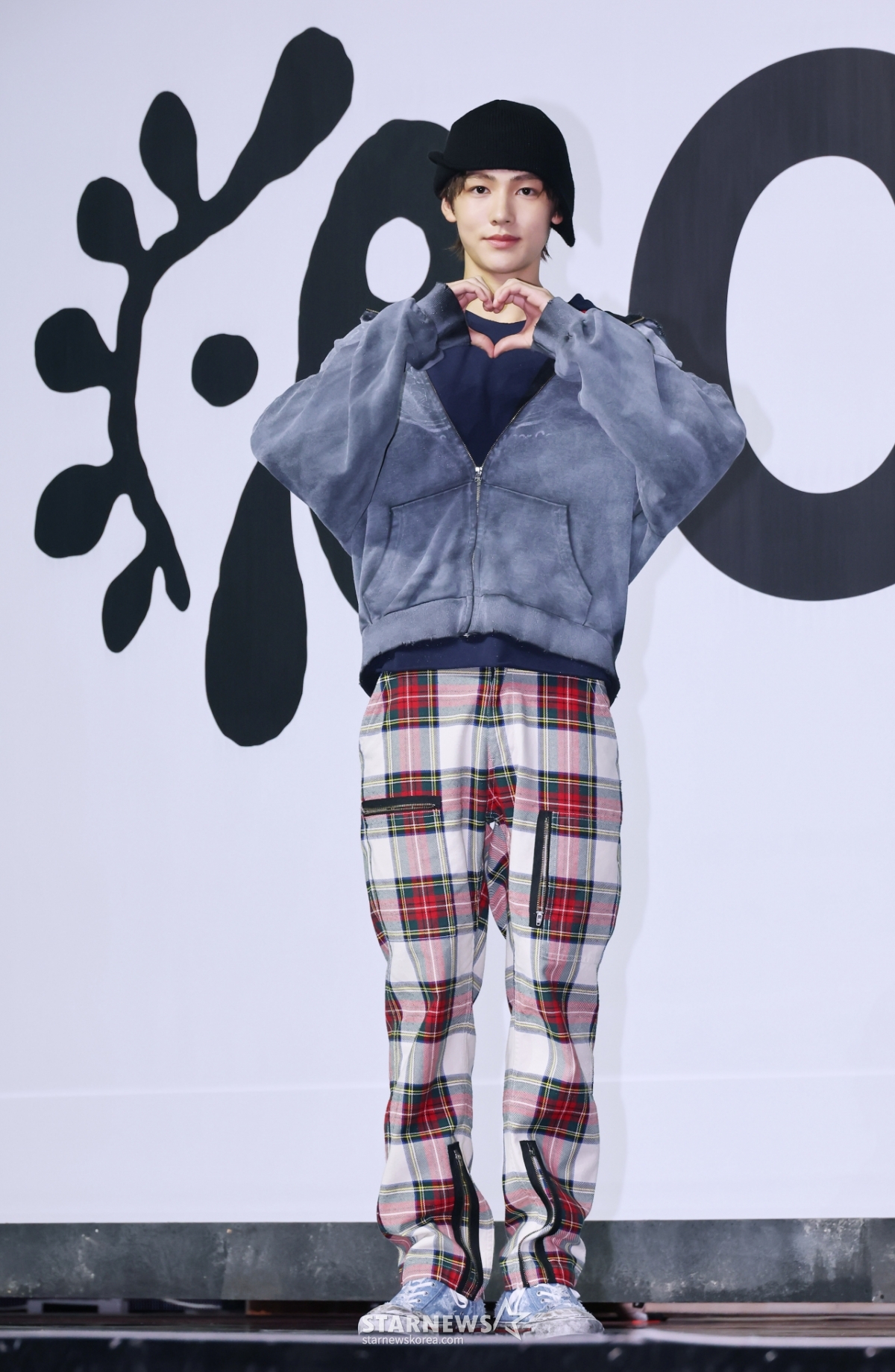 빅히트 신인그룹 코르티스(CORTIS) 성현이 18일 오후 서울 용산구 블루스퀘어에서 진행된 데뷔앨범 '컬러 아웃사이드 더 라인스'(COLOR OUTSIDE THE LINES) 발매기념 쇼케이스에서 포즈를 취하고 있다.