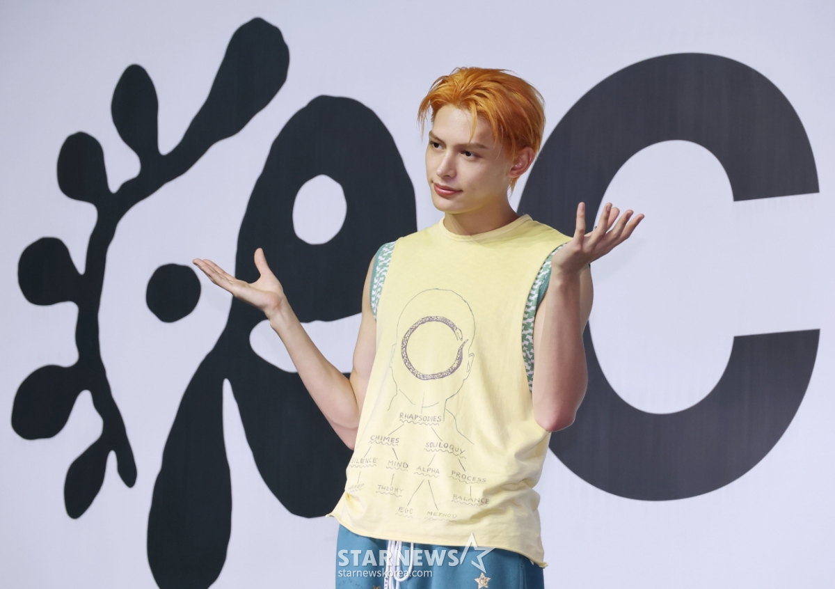 빅히트 신인그룹 코르티스(CORTIS) 제임스가 18일 오후 서울 용산구 블루스퀘어에서 진행된 데뷔앨범 '컬러 아웃사이드 더 라인스'(COLOR OUTSIDE THE LINES) 발매기념 쇼케이스에서 포즈를 취하고 있다.