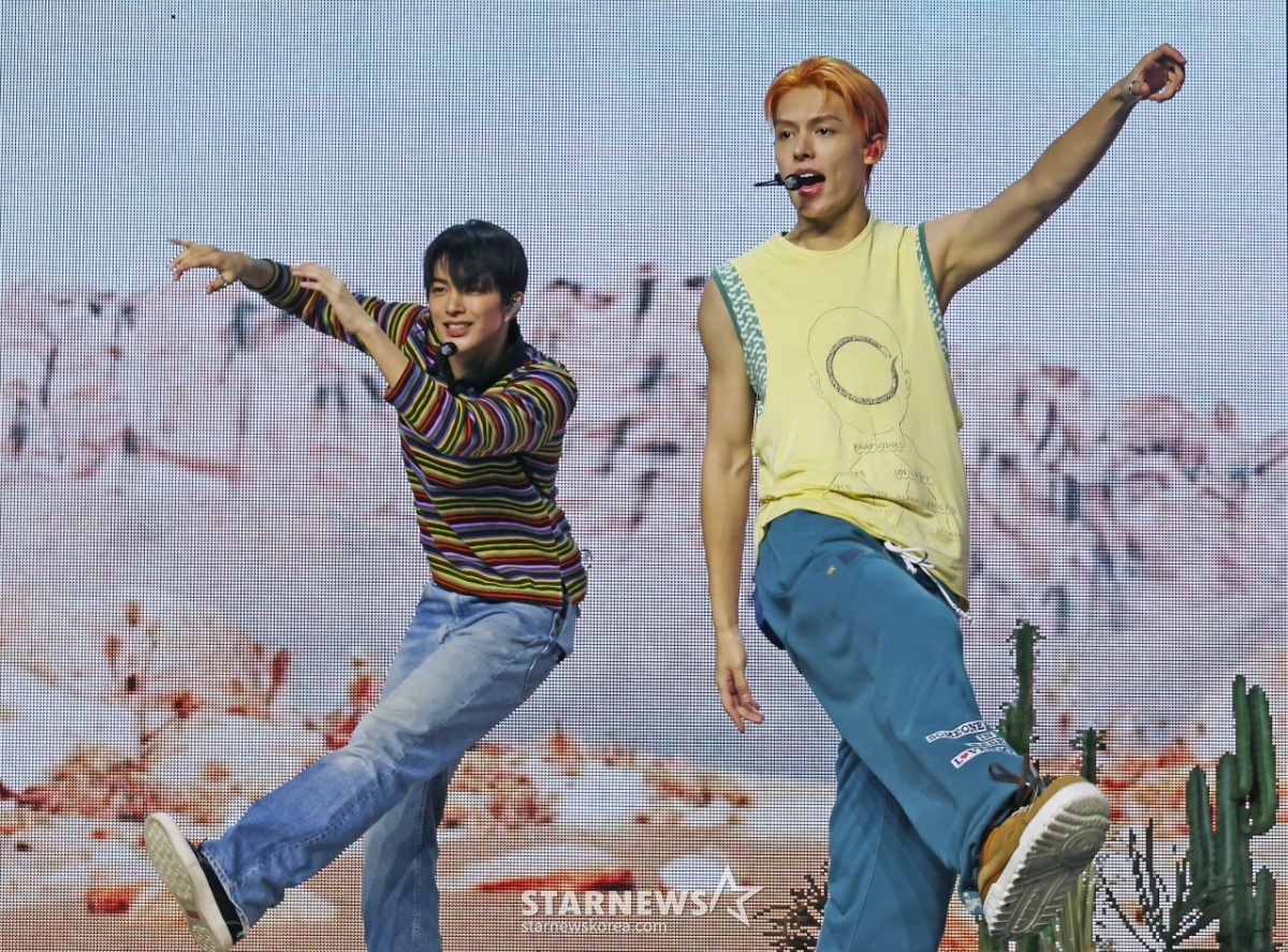 빅히트 신인그룹 코르티스(CORTIS)가 18일 오후 서울 용산구 블루스퀘어에서 진행된 데뷔앨범 '컬러 아웃사이드 더 라인스'(COLOR OUTSIDE THE LINES) 발매기념 쇼케이스에서 타이틀곡을 선보이고 있다.