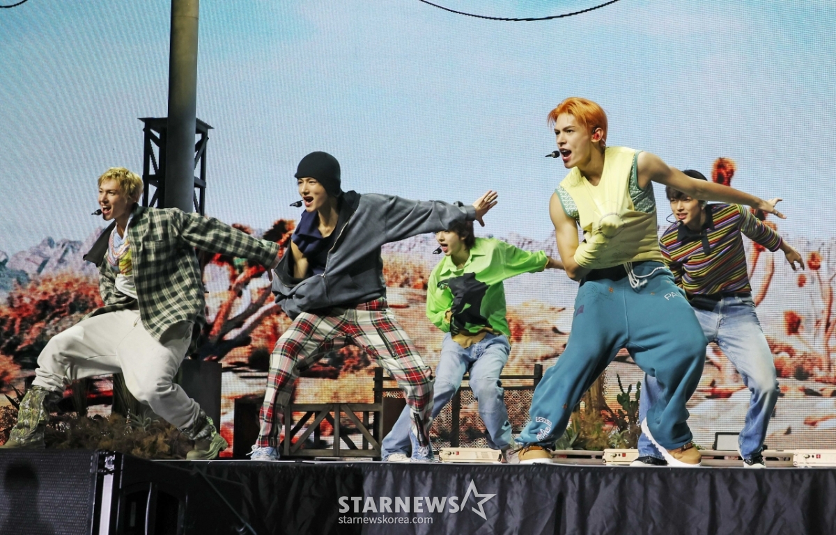 빅히트 신인그룹 코르티스(CORTIS)가 18일 오후 서울 용산구 블루스퀘어에서 진행된 데뷔앨범 '컬러 아웃사이드 더 라인스'(COLOR OUTSIDE THE LINES) 발매기념 쇼케이스에서 타이틀곡을 선보이고 있다.