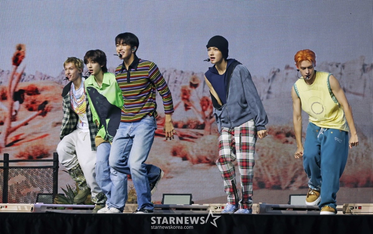 빅히트 신인그룹 코르티스(CORTIS)가 18일 오후 서울 용산구 블루스퀘어에서 진행된 데뷔앨범 '컬러 아웃사이드 더 라인스'(COLOR OUTSIDE THE LINES) 발매기념 쇼케이스에서 타이틀곡을 선보이고 있다.