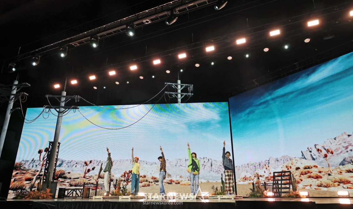 빅히트 신인그룹 코르티스(CORTIS)가 18일 오후 서울 용산구 블루스퀘어에서 진행된 데뷔앨범 '컬러 아웃사이드 더 라인스'(COLOR OUTSIDE THE LINES) 발매기념 쇼케이스에서 타이틀곡을 선보이고 있다.