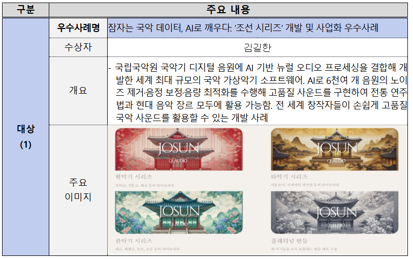 먼저 우수사례 부문 대상 수상작에는 케이-컬처 통합 여정 플랫폼 '케이 인 마이핸즈'와 국악 가상악기 '조선시리즈'가 선정됐다. '케이 인 마이핸즈'는 케이-컬처 팬들에게 언어, 여행, 비자 등의 정보를 제공하고, 케이-콘텐츠 학습부터 실제 여행, 현지 소통까지 끊김이 없는 경험을 지원하는 플랫폼이다. 가상 국악기 '조선 시리즈'는 국립국악원이 제공하는 6000여 개의 국악기 디지털음원을 인공지능으로 최적화하여 창작자 누구나 고품질의 음원을 활용해 손쉽게 국악 음원을 생성할 수 있도록 했으며, 실제 연주에 가까운 생동감을 제공한다.