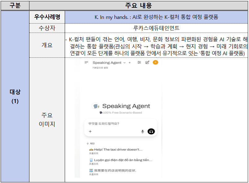 우수상은 인공지능과 확장현실(XR) 기술로 3차원 홀로그램을 구현해 전 세계 어디서든 실시간으로 재생 및 상호작용이 가능한 실시간 소통 플랫폼 '프로토 홀로그램'과 인공지능 고문헌 분석 및 번역 플랫폼 '온고'가 받는다. 장려상은 인공지능 기반 다국어 짧은 영상 제작 플랫폼 '웬디 인공지능(AI) 커머스 솔루션'과 내 주변 전통시장 인공지능 탐방서비스 '시장에 가면'에 수여한다.