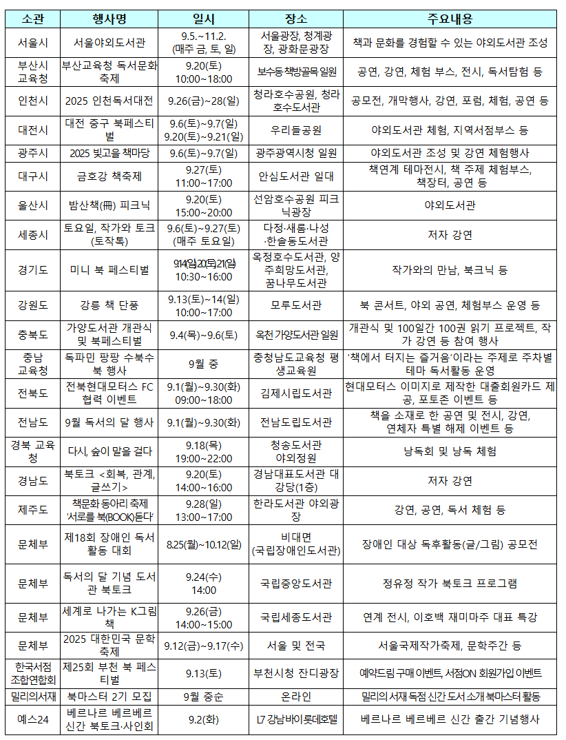 9월 독서의 달을 맞이해 전국의 도서관, 17개 지자체와 교육청 등에서 '읽기 예보 : 오늘 읽음, 내일 맑음'이라는 표어 아래 국민들이 일상에서 독서의 즐거움을 발견할 수 있도록 ▶야외 도서관 운영(서울, 울산, 경남) ▶책방골목 독서 탐험(부산시 교육청), 도전 책 빙고(전북 교육청) 등 책 관련 이색 체험행사와 ▶강연, 전시, 책 시장 등 다양한 프로그램을 마련했다. ▶국립중앙도서관은 독서의 달 기념 '정유정 작가와의 만남'을 ▶국립어린이청소년도서관은 인제 기적의 도서관과 함께 '책 읽어주세요' 캠페인을 ▶국립세종도서관은 '세계로 나가는 케이-그림책'을 주제로 특별강연과 전시를 운영한다. ▶서울 대학로 일대와 지역 문학관 등에서는 '대한민국 문학축제(9월 12~25일)'가 '서울국제작가축제(9월 12~17일)', '문학주간(9월 13~19일)'과 함께 열린다.