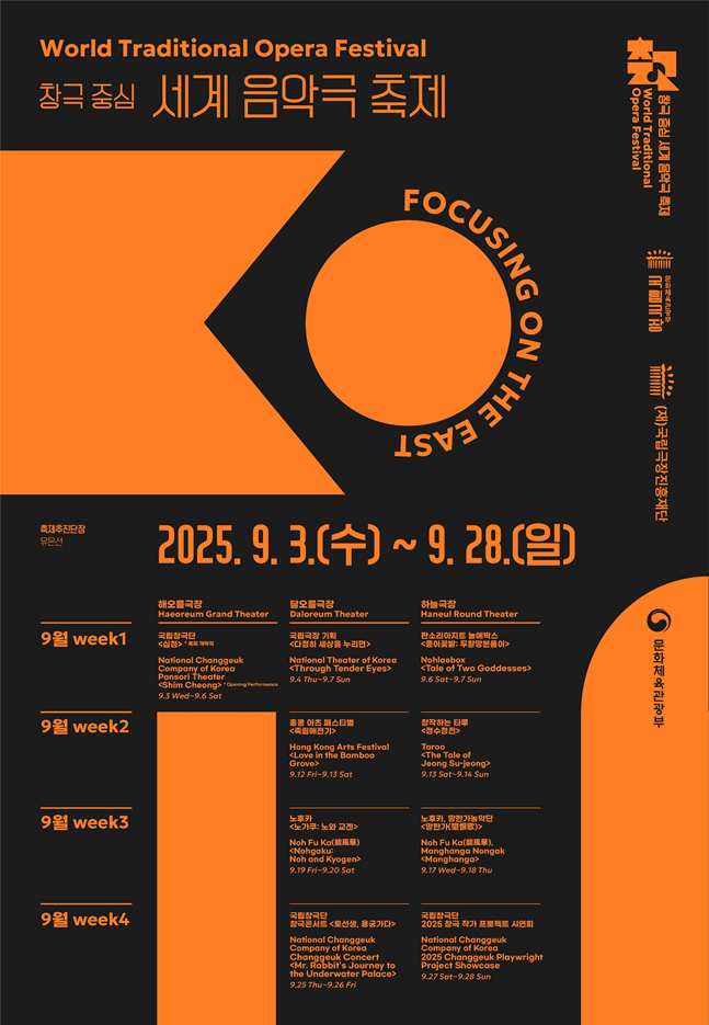 특히 올해 축제의 주제를 '동아시아 포커싱(Focusing on the East)'으로 정하고, 한·중·일 3국 전통 음악극의 전통적 가치와 현대적 매력을 탐구하기 위해 중국과 일본의 음악극 작품도 초청해 소개한다. '2023년 홍콩 아츠 페스티벌'에서 제작돼 비평가들의 호평을 받은 '죽림애전기', 노와 교겐의 주요 작품을 전통에 가까운 양식으로 무대에 올려 일본 전통극의 정수를 보여주는 '노가쿠: 노와 교겐'이 관객을 맞이한다. 일본 전통극 노가쿠와 한국 농악이 만난 한일 합동음악극 '망한가(望恨歌)'도 특별 협업작품으로 선보인다.