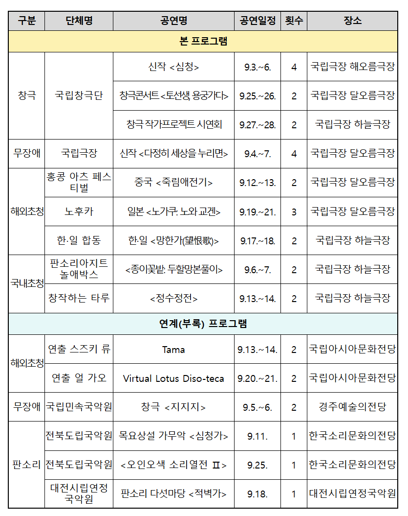 국립극장을 중심으로 국립극장 제작 공연 4편과 해외 초청작 3편, 국내 초청작 2편을 선보이는 올해 행사는 경주, 광주, 대전, 전주 등 전국 주요 국공립공연장에서 열리는 창극, 판소리 공연과도 연계해 진행한다.