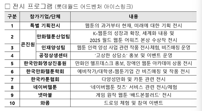 롯데시네마 월드타워점 8관에서도 ▶'테러맨', '샤크', '이태원클라쓰' 등 웹툰에서 다른 분야로 확장된 작품을 주제로 원작자가 참여하는 이야기 콘서트, ▶웹툰이 원작인 애니메이션 '도토리 문화센터' 상영회 ▶카카오엔터테인먼트 피디(PD)가 신인 작가들을 대상으로 경험을 공유하는 강연 ▶'2025 네이버웹툰 고등 최강자전', '대학만화웹툰대전' 공모전 시상식 등 웹툰을 주제로 한 여러 행사가 열린다. 기획전시와 다양한 체험행사에는 누구나 무료로 참여할 수 있으며, 행사에 참여하려면 '2025 월드 웹툰 페스티벌' 공식 누리집에서 사전 신청을 하거나 현장에서 등록하면 된다.