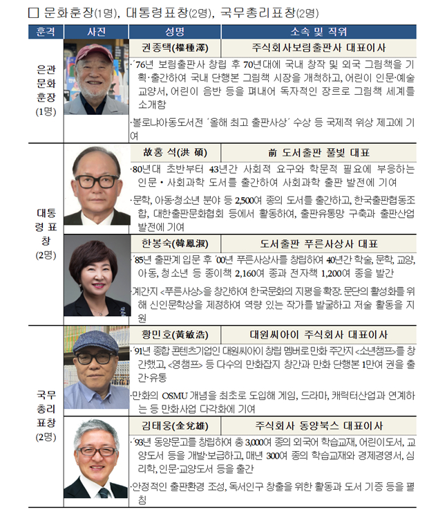 문체부는 매년 출판문화산업 진흥을 통해 출판 생태계 활성화에 기여해 온 출판인들을 발굴, 포상해 출판인들의 사기를 진작하고 관련 업계의 발전을 도모해 왔다. 올해 포상 대상은 은관문화훈장 1명, 대통령 표창 2명, 국무총리 표창 2명, 문체부 장관 표창 24명 등 총 29명이다.