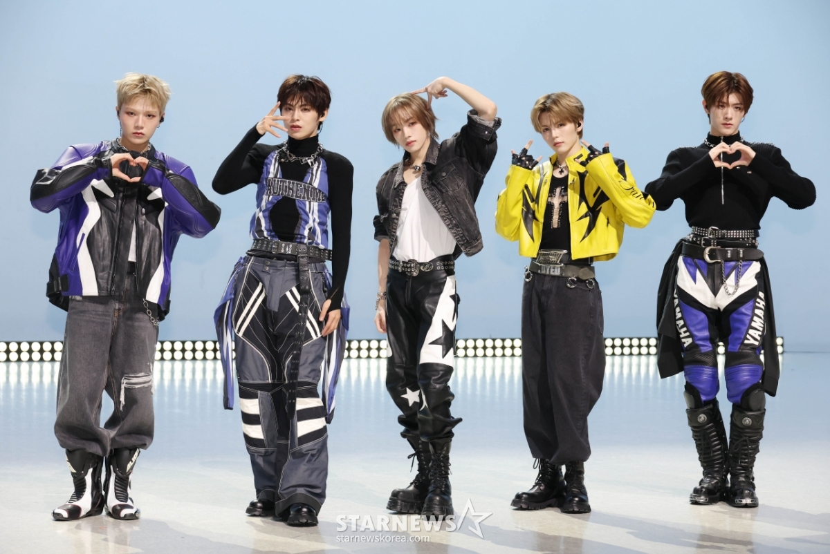 5인조 신인 보이그룹 AM8IC(엠빅)이 10일 오후 서울 마포구 상암동 MBC 공개홀에서 진행된 첫 번째 EP ‘LUKOIE'(루코이에) 발매기념 쇼케이스에서 포즈를 취하고 있다.