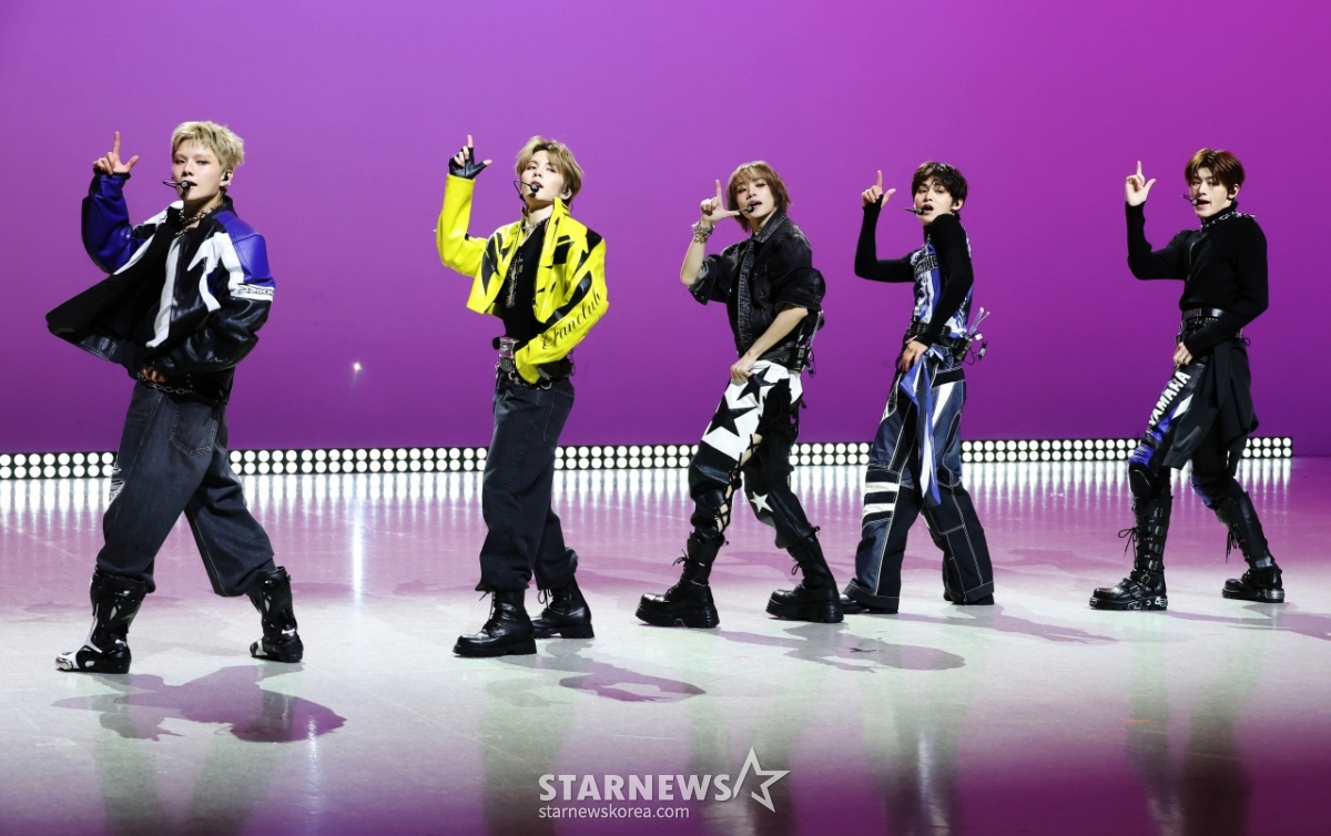 5인조 신인 보이그룹 AM8IC(엠빅)이 10일 오후 서울 마포구 상암동 MBC 공개홀에서 진행된 첫 번째 EP ‘LUKOIE'(루코이에) 발매기념 쇼케이스에서 데뷔곡을 선보이고 있다.