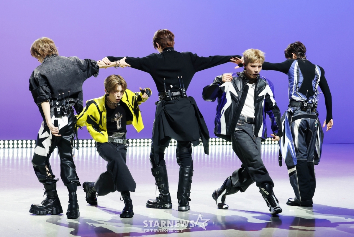 5인조 신인 보이그룹 AM8IC(엠빅)이 10일 오후 서울 마포구 상암동 MBC 공개홀에서 진행된 첫 번째 EP ‘LUKOIE'(루코이에) 발매기념 쇼케이스에서 데뷔곡을 선보이고 있다.