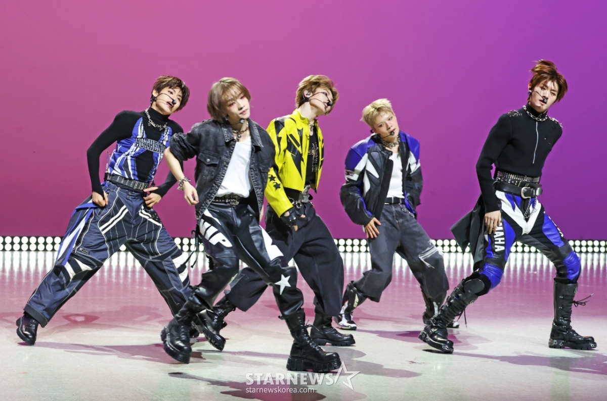 5인조 신인 보이그룹 AM8IC(엠빅)이 10일 오후 서울 마포구 상암동 MBC 공개홀에서 진행된 첫 번째 EP ‘LUKOIE'(루코이에) 발매기념 쇼케이스에서 데뷔곡을 선보이고 있다.