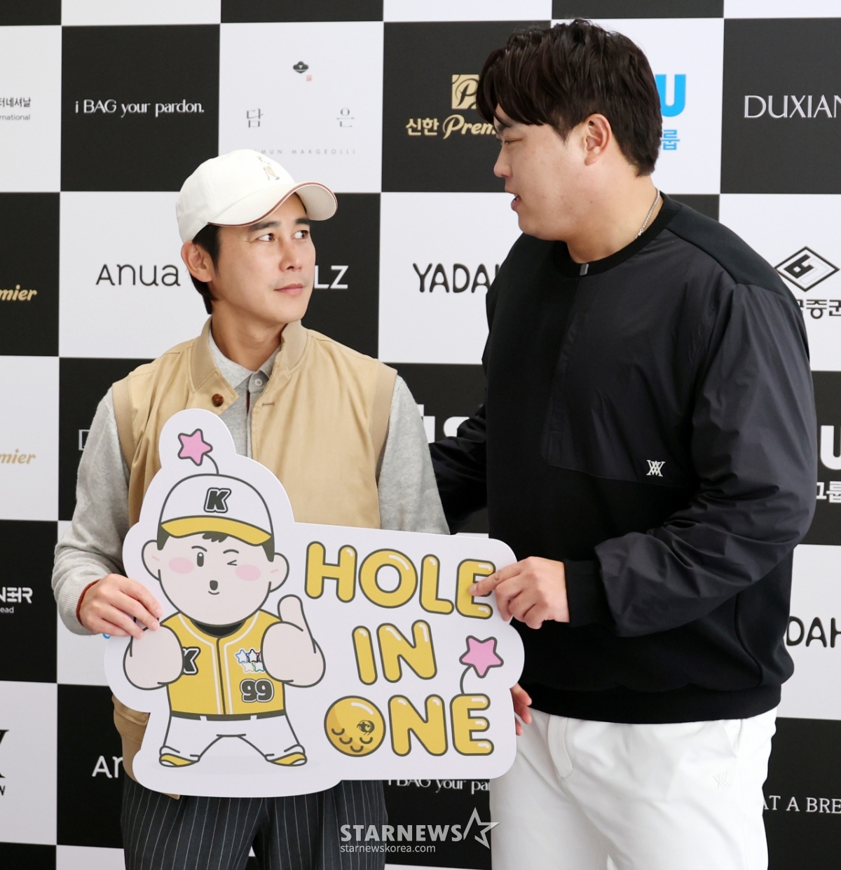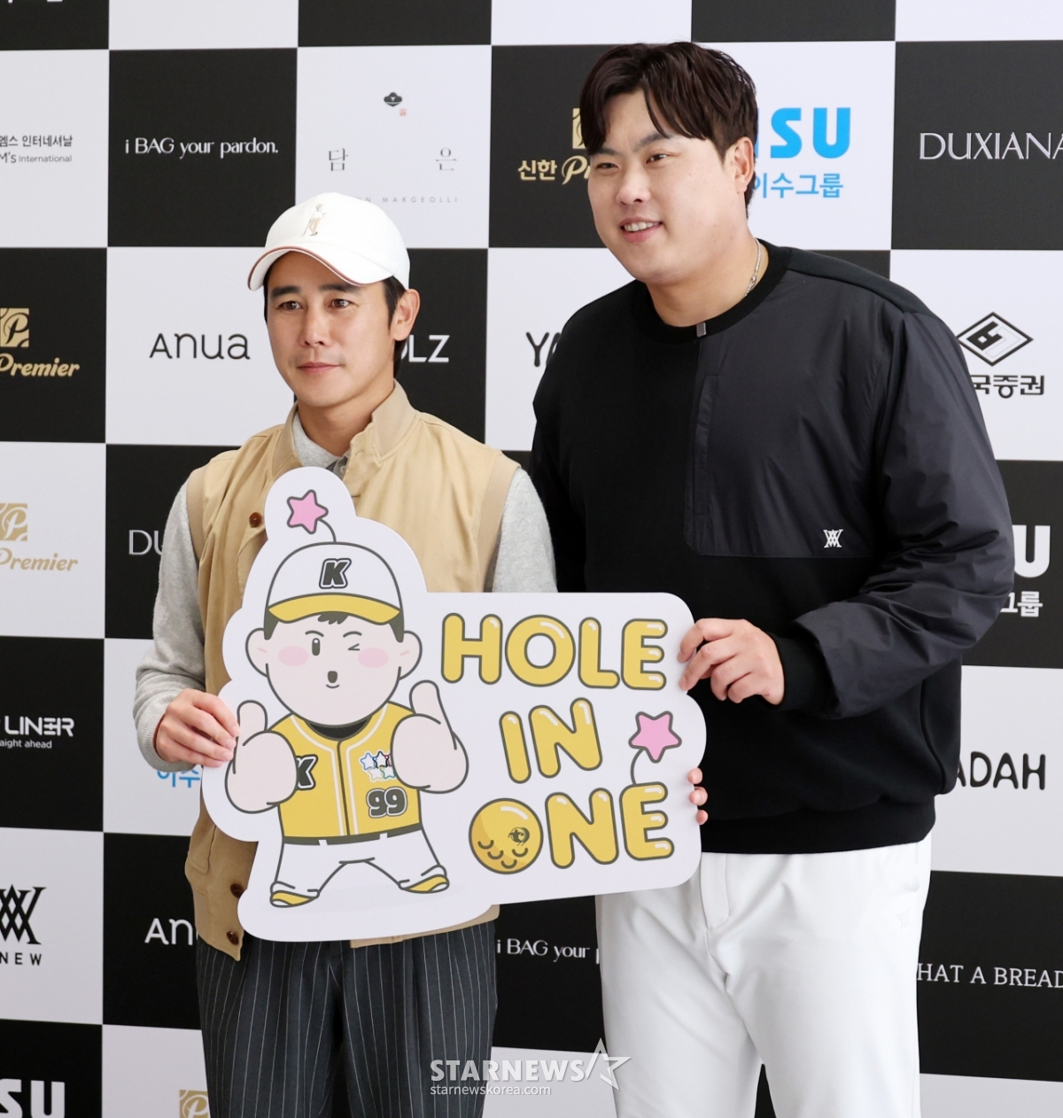 배우 정태우가 12일 횡성군 벨라45컨트리클럽에서 열린 자선기금 마련을 위한 '이수그룹과 함꼐하는 2025 류현진재단 자선골프대회'에 참가해 류현진과 포토타임을 갖고 있다. 2025.11.12.