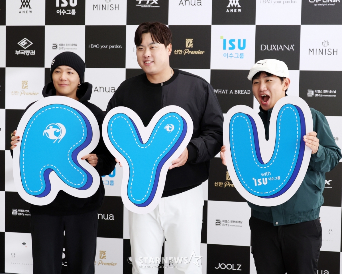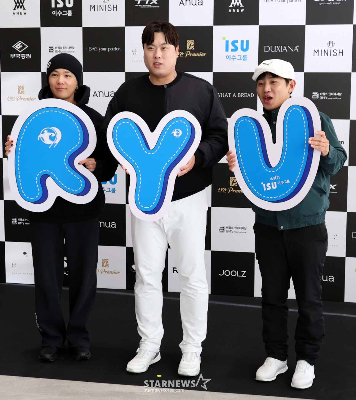 이홍기가 12일 횡성군 벨라45컨트리클럽에서 열린 자선기금 마련을 위한 '이수그룹과 함꼐하는 2025 류현진재단 자선골프대회'에 참가해 류현진과 포토타임을 갖고 있다. 2025.11.12.