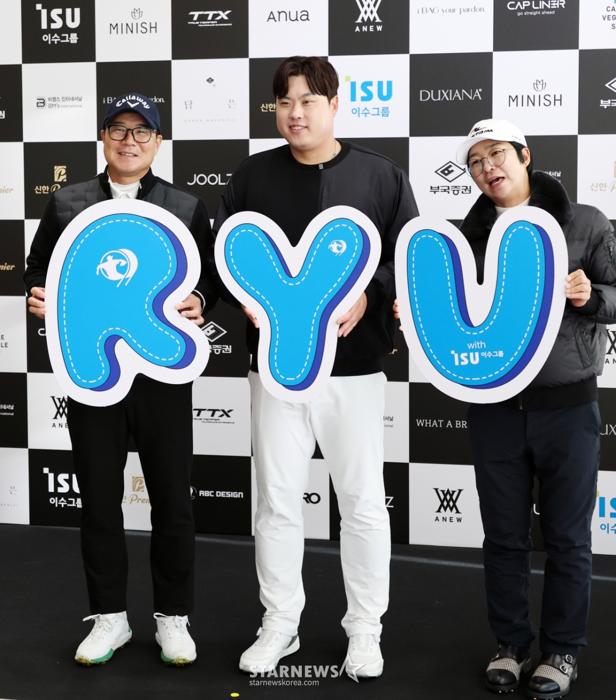 이형택과 홍인규가 12일 횡성군 벨라45컨트리클럽에서 열린 자선기금 마련을 위한 '이수그룹과 함꼐하는 2025 류현진재단 자선골프대회'에 참가해 류현진과 포토타임을 갖고 있다. 2025.11.12.