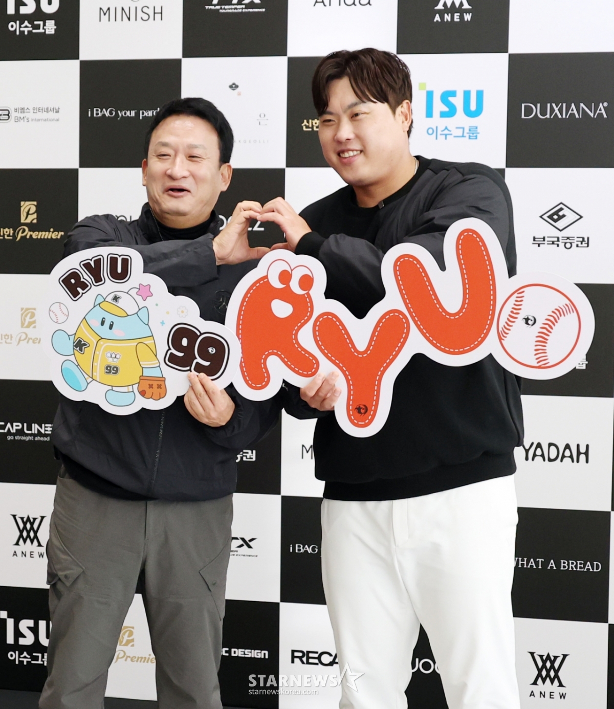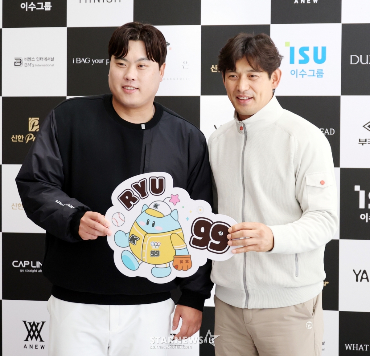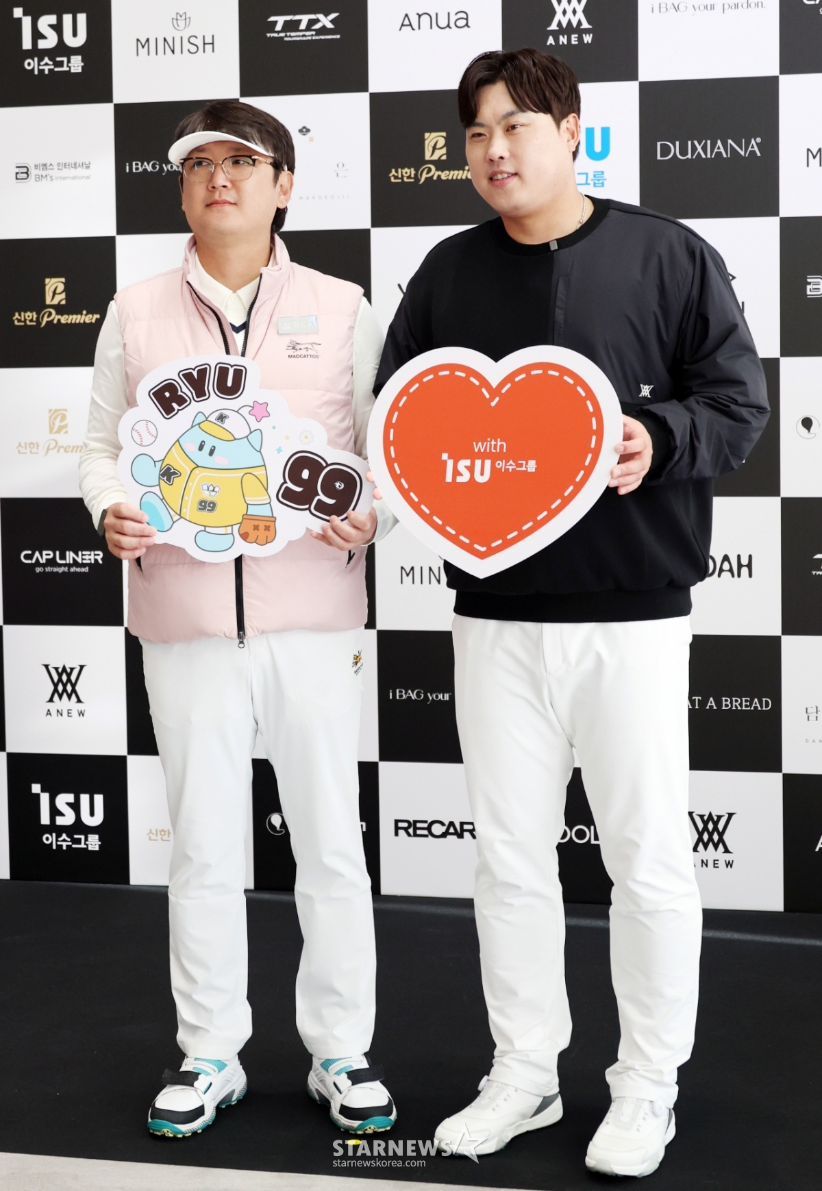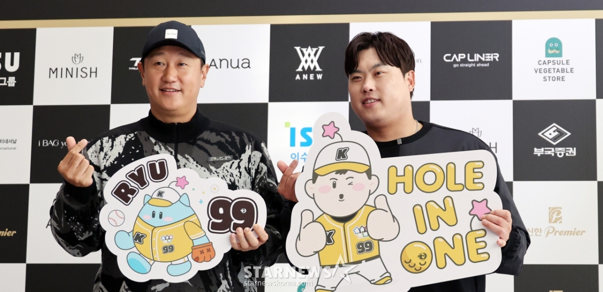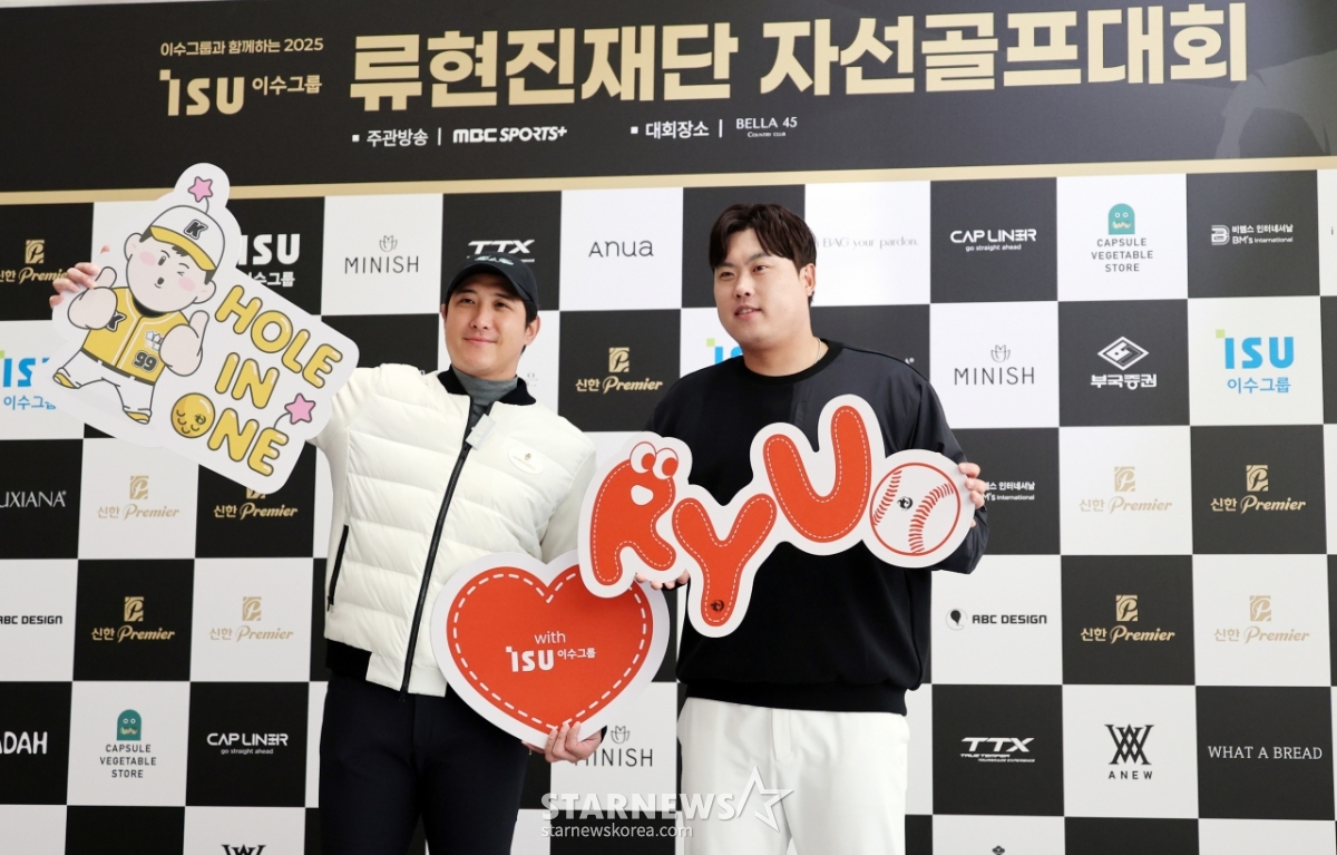류현진재단 이사장과 배지헌이사가 12일 횡성군 벨라45컨트리클럽에서 열린 자선기금 마련을 위한 '이수그룹과 함꼐하는 2025 류현진재단 자선골프대회'에서 행사를 시작하며 포토타임을 갖고 있다.