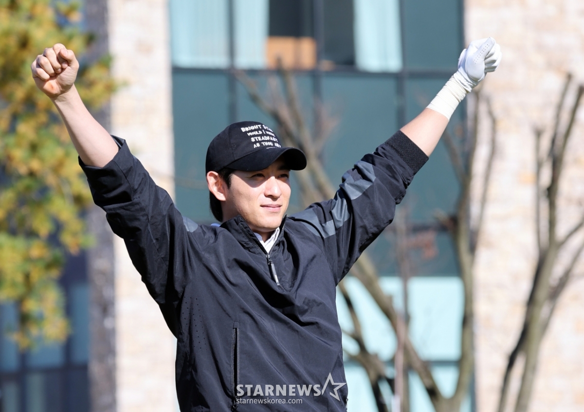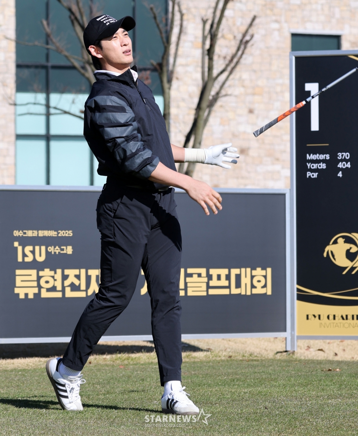 '바람의 손자' 이정후가 12일 횡성 벨라45컨트리클럽에서 열린 '2025 류현진재단 자선골프대회에서 멋진 티샷을 선보이며 마치 만루홈런을 터트린 양 빠던과 함께 굿샷 세리머니를 펼쳤다.