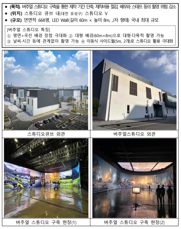 문화체육관광부(장관 최휘영)는 한국콘텐츠진흥원(원장 직무대행 유현석)과 함께 3일 오후 2시 '스튜디오큐브(대전광역시 유성구)'에서 국내 최대 규모의 '버추얼 스튜디오' 개관식을 개최한다고 밝혔다. 김영수 문체부 제1차관은 개관식을 찾아 최첨단 제작 기술 현장을 살펴보고 관계자들을 격려한다.