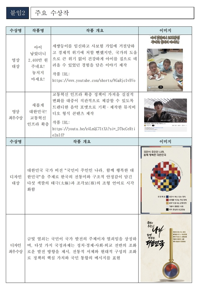 영상 부문에서는 국정과제 '아이 키우기 좋은 출산·육아 환경조성'과 관련해 본인 경험을 짧은 영상으로 담은 최문석 씨가 대상을 받는다. 올해 세쌍둥이 출산으로 4남매의 아빠가 된 수상자는 "내 또래 청년들에게 대한민국의 든든한 지원이 있다는 사실을 알리고 싶었다"며 '아이 낳았더니 2400만 원 주네요! 놓치지 마세요!!'라는 제목의 영상을 통해 출산 현실의 어려움과 함께 미숙아 의료비 지원과 건강보험 제도 등 실질적으로 도움이 되는 국가 정책을 소개했다.