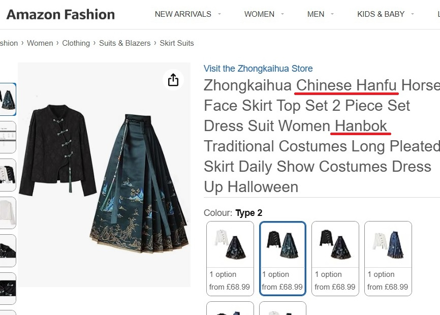 '아마존'에서 '한푸=한복'으로 판매하는 업체들이 다수 발견돼 논란이 일고 있다.