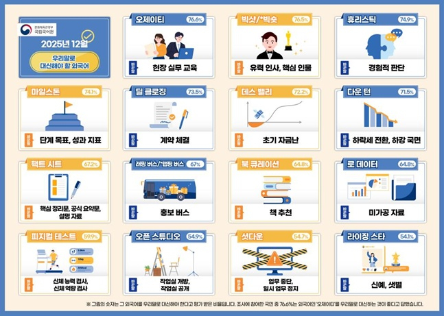 조사 결과 국민이 우리말로 바꾸어 써야 한다고 가장 많이 꼽은 외래 용어는 '오제이티'(76.6%)와 '빅샷/빅숏'(76.5%), '휴리스틱'(74.9%), '마일스톤'(74.1%), '딜 클로징'(73.5%)이었다. 이에 따라 '오제이티(OJT)'는 '현장 실무 교육'으로, '빅샷/빅숏'은 '유력 인사' 또는 '핵심 인물'로, '휴리스틱'은 '경험적 판단'으로, 업무 추진 단계에서 기준이 되는 '마일스톤'은 '단계 목표' 또는 '성과 지표'로, 계약 성사 과정을 뜻하는 '딜 클로징'은 '계약 체결'로 이해하기 쉽게 다듬었다.