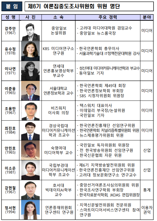 새로 위촉된 위원은 ▶강주안 중앙일보 논설위원(이하 성명 가나다순) ▶강현철 호서대 빅데이터에이아이(AI)학부 교수 ▶안민호 숙명여대 미디어학부 교수 ▶유수정 케이비에스(KBS) 미디어연구소 연구원 ▶이나연 연세대 언론홍부영상학부 부교수 ▶이소은 국립부경대 미디어커뮤니케이션학부 조교수 ▶이준웅 서울대 언론정보학과 교수 ▶정서현 언론중재위원회 연구원 ▶조용만 비즈워치 이사회 의장 ▶최진호 경상국립대 미디어커뮤니케이션학과 조교수 등으로 미디어, 산업, 통계, 이용자권익 분야 등의 전문가로 구성했다.